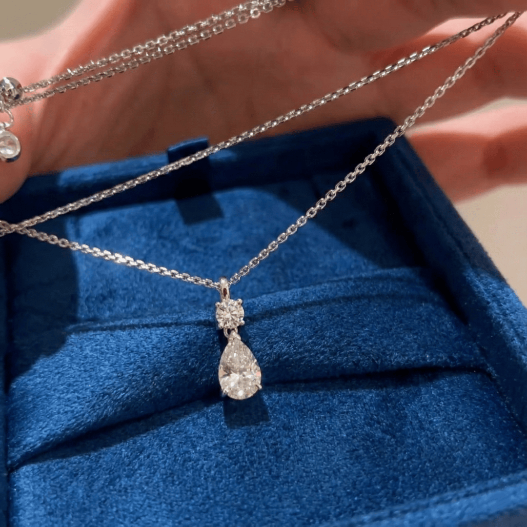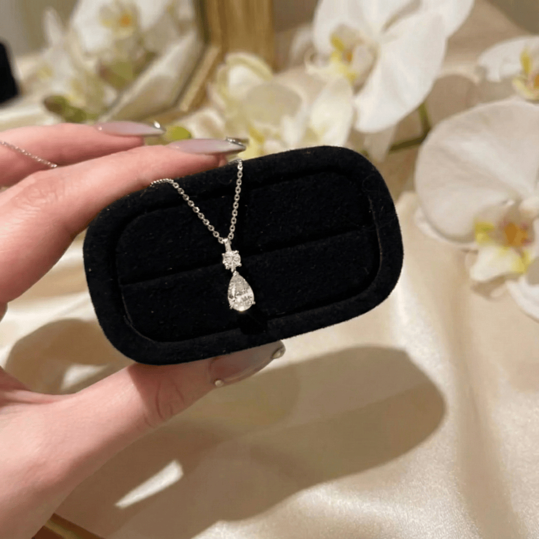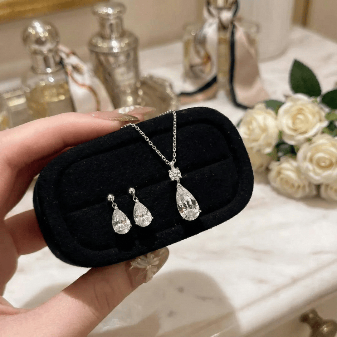 The Drop Diamond Necklace & Earrings Set by CotaJewelry celebrates timeless elegance with celestial-inspired pear-cut cubic zirconia stones that capture light beautifully. Crafted for both grace and modern sophistication.